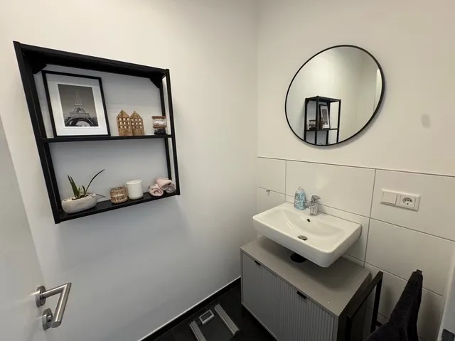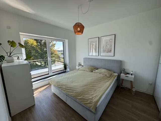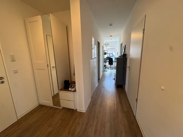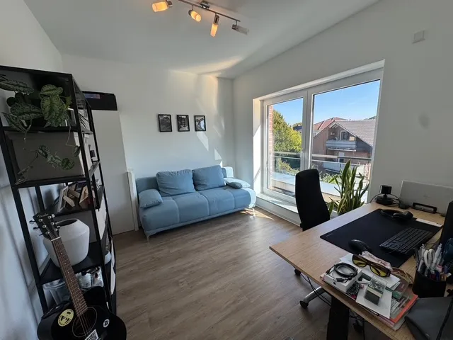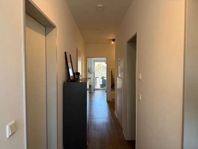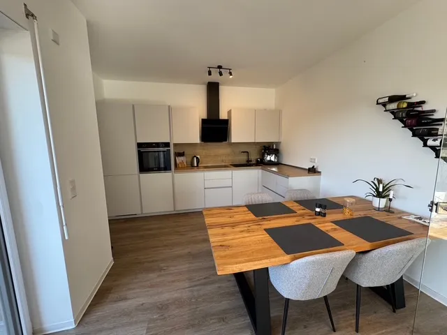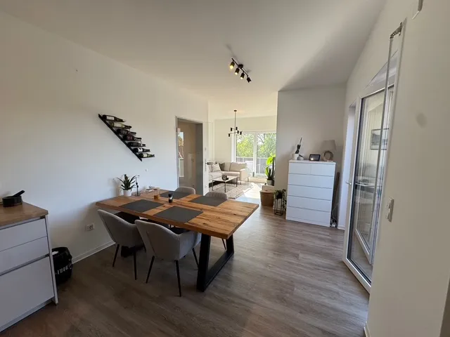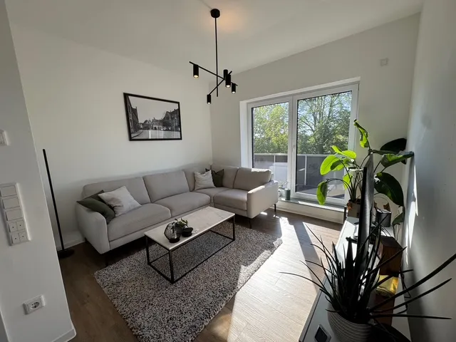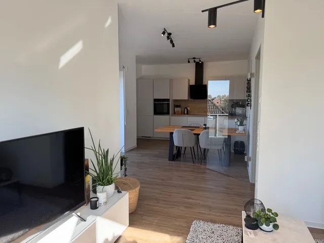 Sie ist perfekt aufgeteilt und verfügt über eine Komfortausstattung. Fußbodenheizung, elektrische Rollläden, bodengleiche Dusche, Gäste-WC und ein Abstellraum innerhalb der Wohnung sind praktisch und angenehm zugleich. Das Wohnzimmer ist in L-Form angelegt und entspricht mit der angegliederten, offenen Küche dem heutigen Zeitgeist. Zwei Schlafzimmer, ein Badezimmer sowie ein komfortabler Flur runden das Angebot ab.